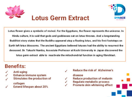 📌Lotus Germ Extract offers the following benefits: Anti-aging, Enhance Immune system, stimulates the production of collagen, Extend lifespan about 20%, Reduce the risk of Alzheimer's disease, Reduce production of melanin, Regulate metabolic process, promote skin whitening effect.